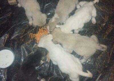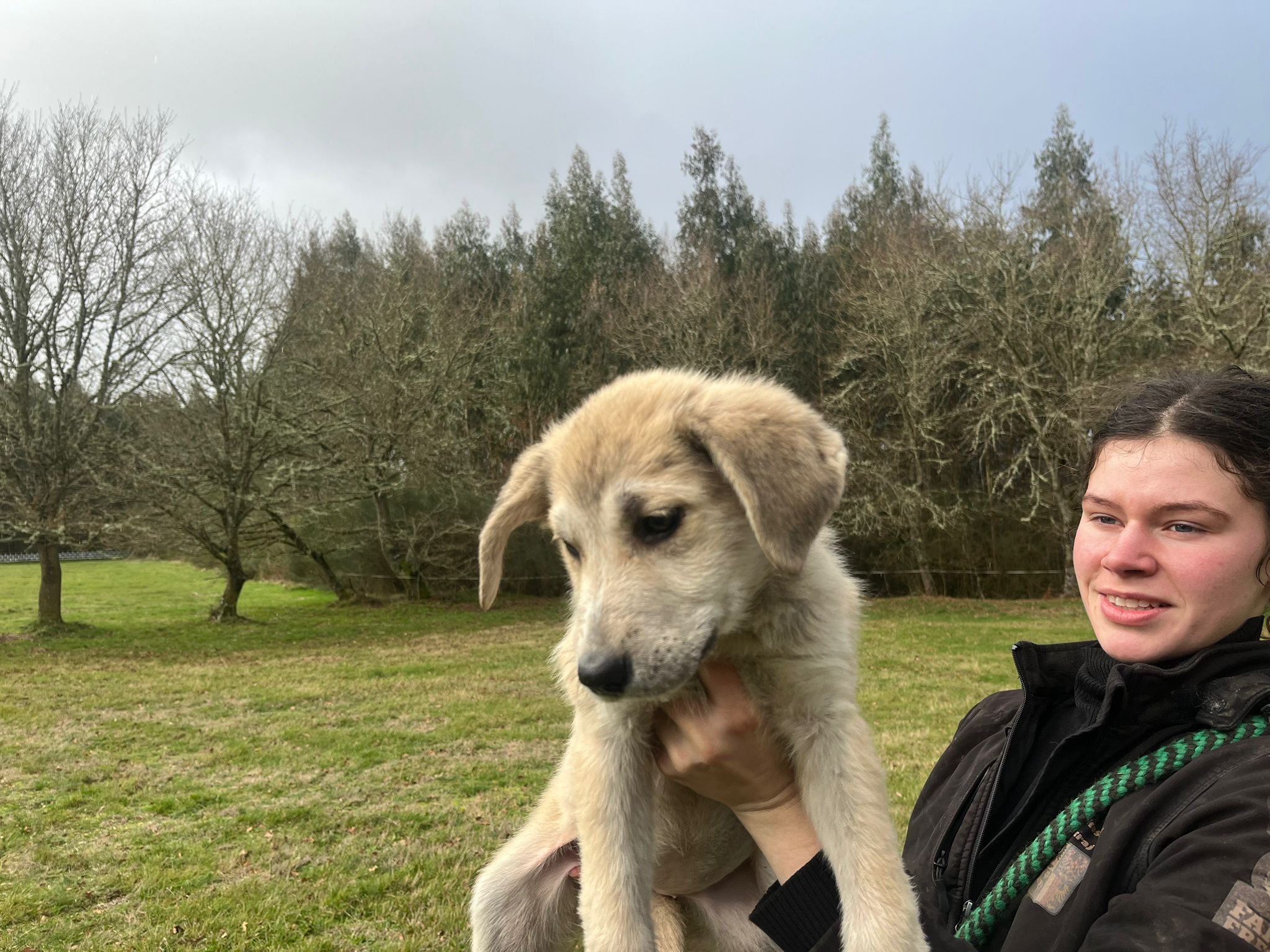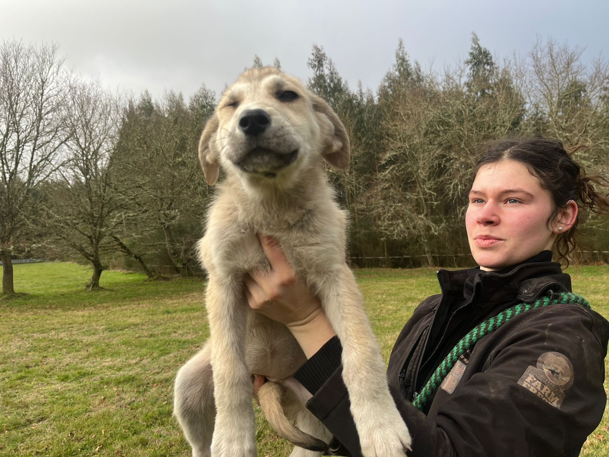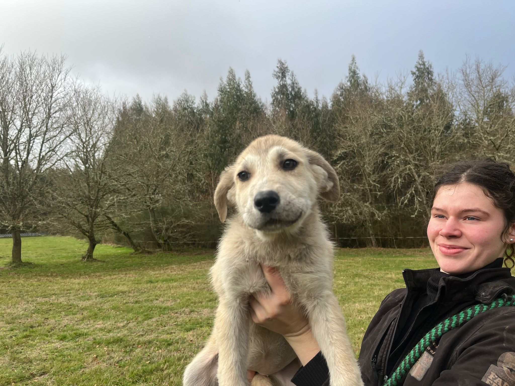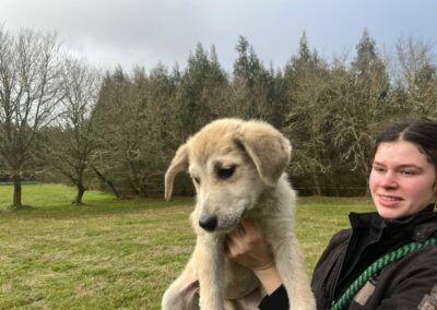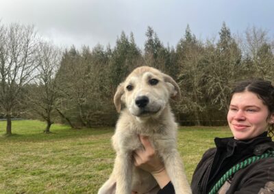 Donner and her siblings were rescued from a mountain farm where they were found in December 2025 eating from a rubbish pile, no mother in sight. Donner travelled to UK 9 March 2026 to join her new family, rehomed via Blind Dog Rescue UK.