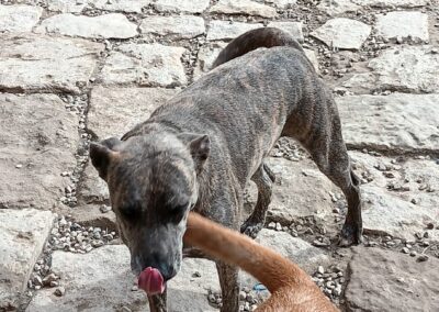 Rivia was born in Spain but her past is unknown, as she was rescued from a shelter where she had been isolated for over a year with another dog called Star, who may be her sister. She is great with other dogs and clean in the house, but is still quite nervous around people she is uncertain of, so would do well with calm, patient people, or in a foster home initially where she can continue learning all about being in a family and home.